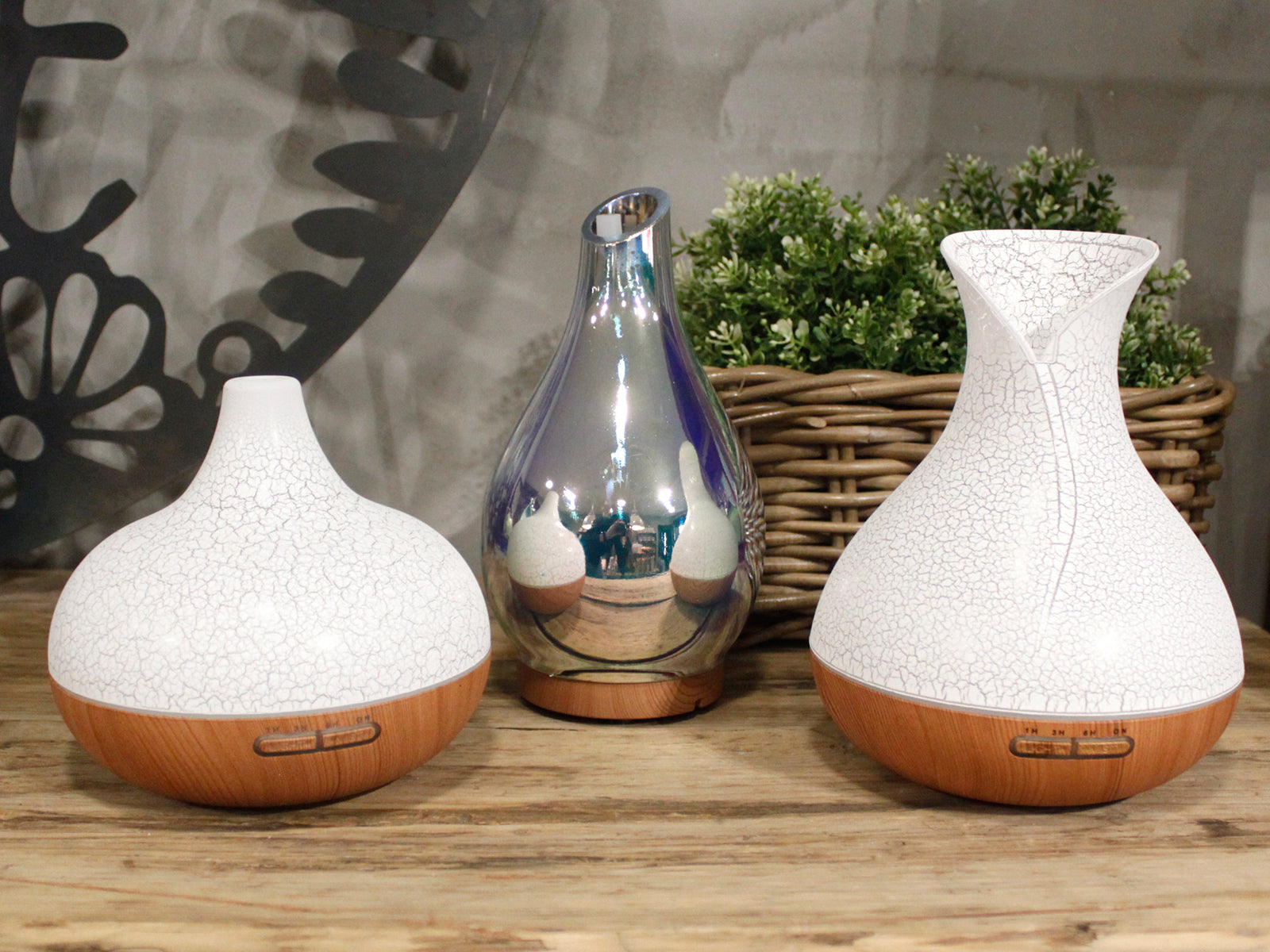 A Nagykereskedelmi Santorini Aroma Diffúzor - Repedezett Hatás -USB - Színváltós - Időzítővel ultrahang hullámokat használ a tartályban lévő víz és illóolaj párologtatására, hogy így száraz, illatos, finom köd keletkezzen.